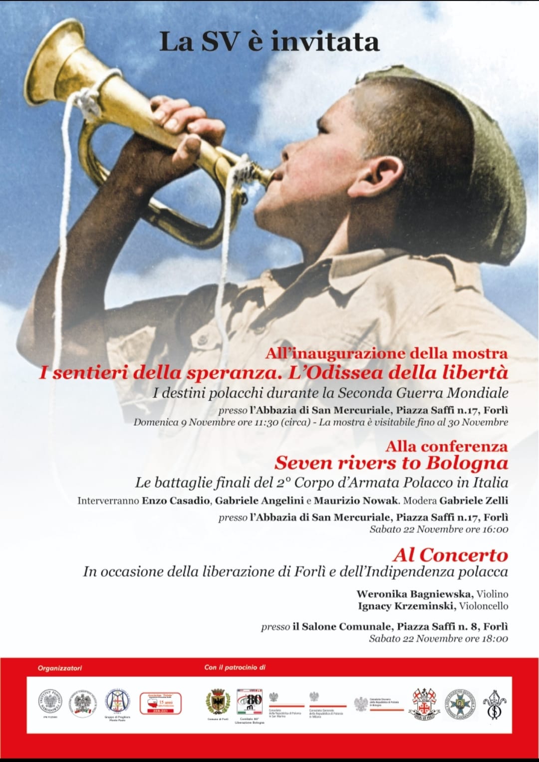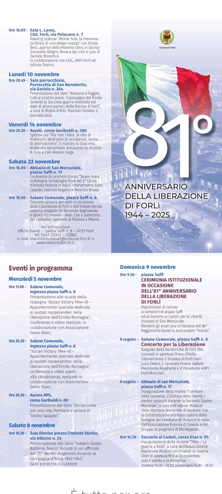 31 Ottobre Conferenza sulla liberazione di Cesena ore 15,30 presso il teatro “Don Baronio”, via Mulini 24 Cesena 9 Novembre Anniversario della liberazione di Forlì. Nella mattinata in piazza Aurelio Saffi, onori ai caduti nella 2 Guerra Mondiale e posa…