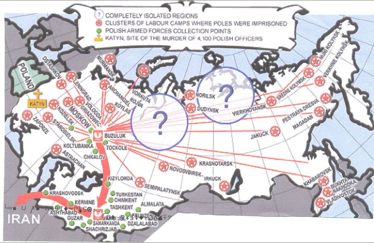 I campi di prigionia polacchi in Unione Sovietica: sono evidenziate con cerchi le zone dalle quali non provenivano notizie e con una scritta in giallo la località di Katyn