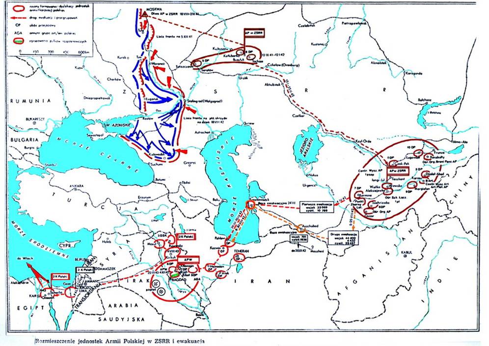 Il Governo polacco, in esilio a Londra, ruppe le relazioni diplomatiche con l’Unione Sovietica, i soldati polacchi erano diventati davvero un problema. I governi alleati, in grave imbarazzo, stabilirono di trasportare l’Armata in formazione prima in Iran dal porto di Krasnowodsk, attraverso il Mar Caspio, a Bandar Pahlavi, e poi in Iraq a Kirkuk dove furono posti a guardia dei campi petroliferi. Intanto finalmente arrivavano, dall’Inghilterra, i viveri, il vestiario e gli armamenti per poter addestrare di nuovo i soldati polacchi.