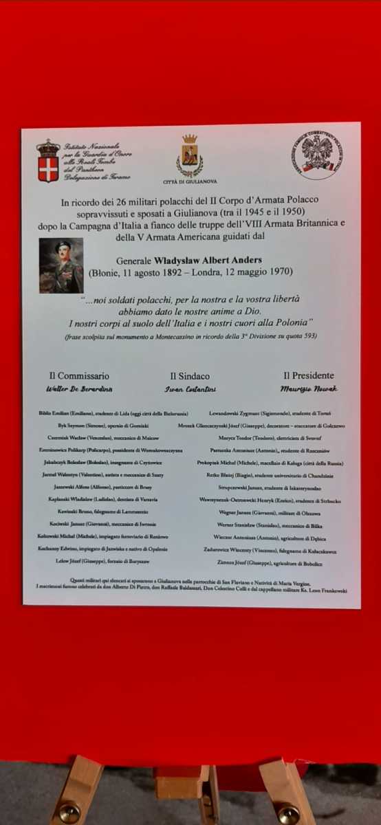 GIULIANOVA, 26 APR – Una mostra dedicata al II Corpo d’Armata polacco è stata inaugurata nel loggiato ‘Riccardo Cerulli’ di Giulianova per ricordare il passaggio e il ruolo dell’esercito polacco nella Liberazione d’Italia: a tagliare il nastro il sindaco Jwan Costantini e l’ambasciatrice della Polonia in Italia, Anna Maria Anders.